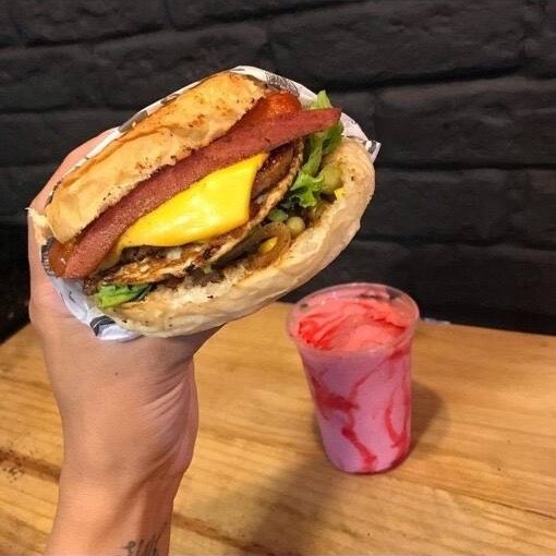 Sublime búrguer com pão, carne industrial, calabresa, ovo, queijo, alface, tomate, cebola, milho e ervilha.