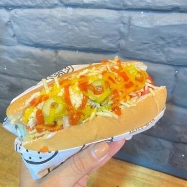 Pão, salcisinha, calabresa, tomate, cebola, milho e ervilha, batata palha, queijo ralado