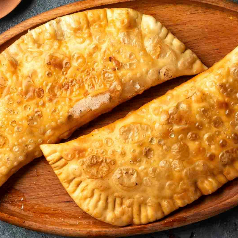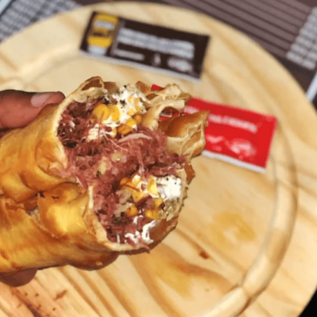 Pastel de massa artesanal recheado com patê de camarão e camarões salteados e o queridinho cream cheese .