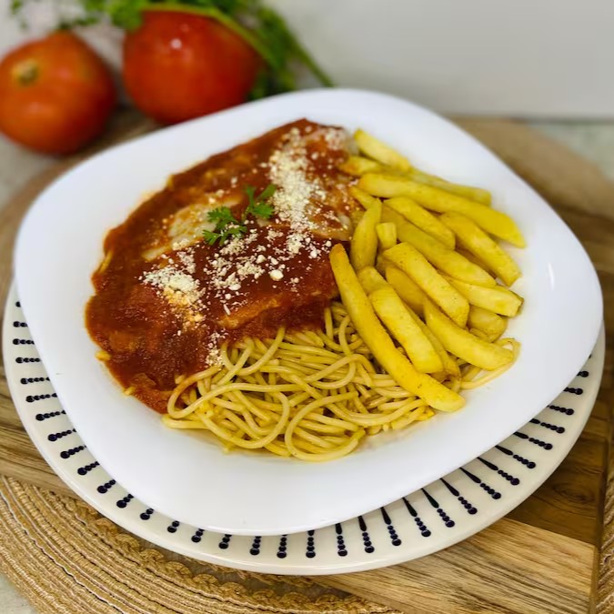 Deliciosa 'Parmegiana de Frango' com filé de frango empanado, coberto com nosso molho de tomate natural e gratinado com mussarela. Acompanha, à sua escolha, macarrão ou arroz, junto com batatas fritas e queijo ralado de primeira qualidade.