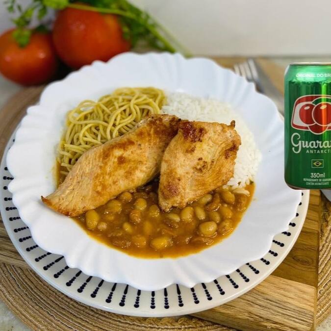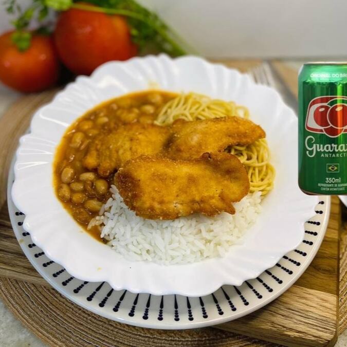 Delicio filé de frango empanado, acompanhado Arroz branco soltinho, macarrão temperado e Feijão Mulatinho ou preto a sua escolha + Bebida geladinha.