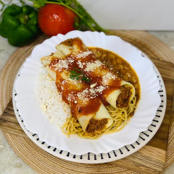 Deliciosa Panqueca de carne moída de Primeira qualidade, com arroz branco, macarrão, feijão mulatinho ou preto a sua escolha, coberta com a mais fina mussarela com queijo ralado e nosso exclusivo molho de tomate natural.