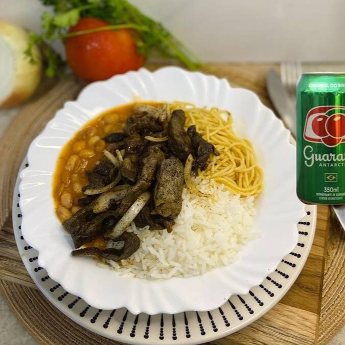 Delicioso Fígado Bovino com anéis de cebola, acompanhado de Arroz Branco, feijão mulatinho ou preto a sua escolha, macarrão ao molho e farofa temperada, tudo preparado na hora da entrega pra sua refeição chegar bem quentinha.