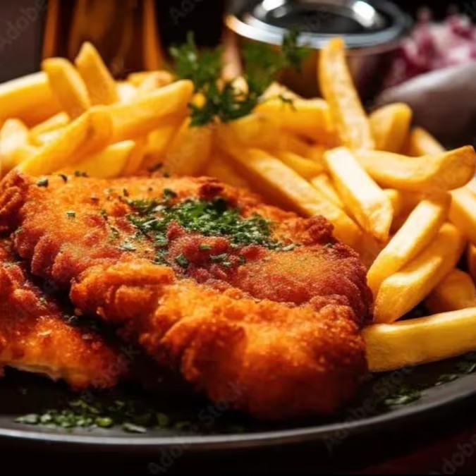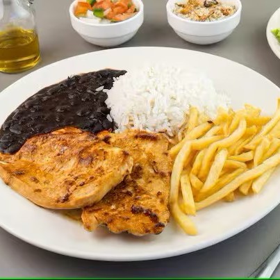 Delicioso filé de peito empando, acompanhado Arroz branco soltinho, macarrão temperado e Feijão Mulatinho ou preto a sua escolha.