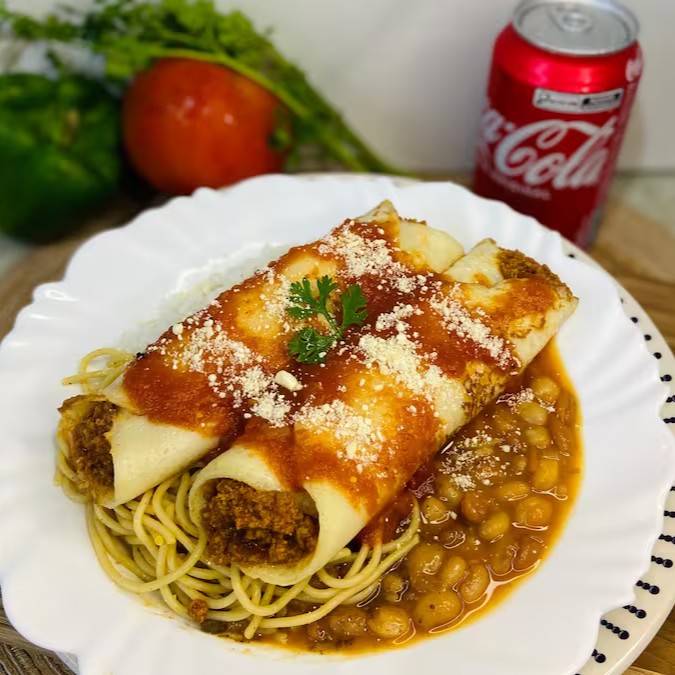 Deliciosa Panqueca de carne moída de Primeira qualidade, com arroz branco, macarrão, feijão mulatinho ou preto a sua escolha, coberta com a mais fina mussarela com queijo ralado e nosso exclusivo molho de tomate natural. + Bebida gelada.