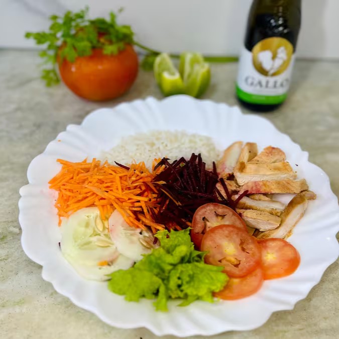 Deliciosas iscas de Filé de frango Grelhado, Acompanhado de arroz branco levinho e uma deliciosa salada de alface, pepino, tomate, cenoura e beterraba raladas, Levemente regada com fios de azeite extra virgem + coca zero para não sair da dieta.