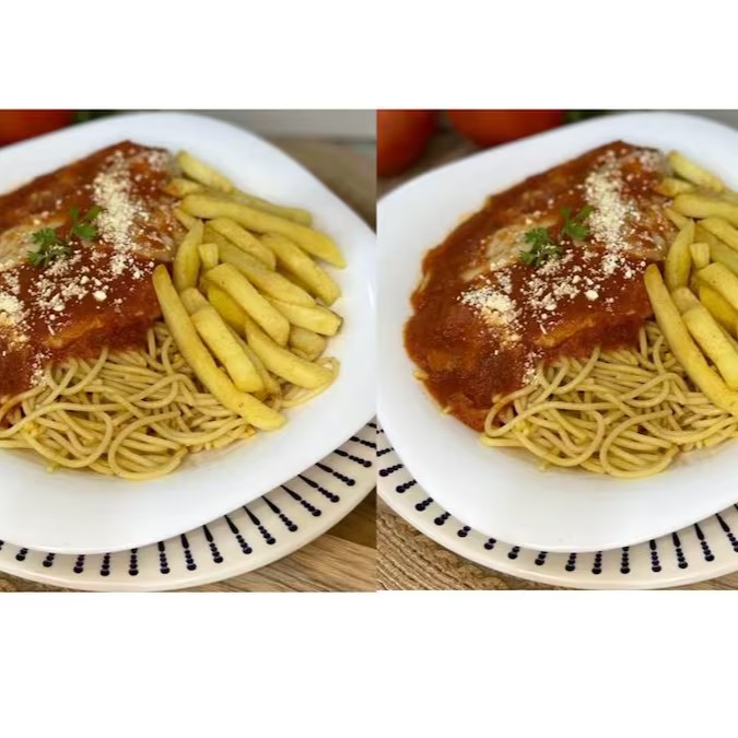 Duas parmegiana de frango no capricho, acompanhadas de macarrão ou arroz, com aquele sabor que todos amam.