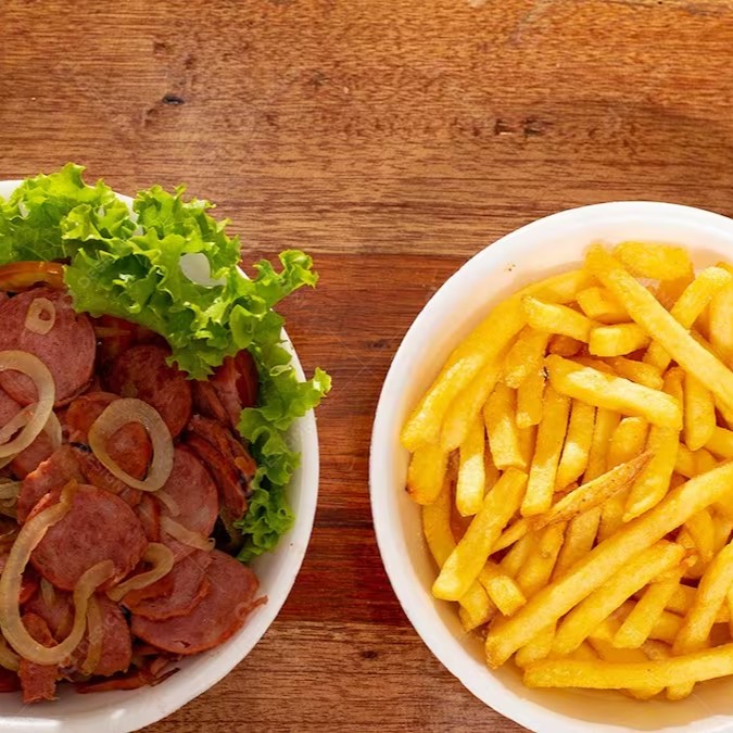 Marmita de calabresa com batatas fritas no capricho, feita na hora para a marmita chegar bem quentinha.