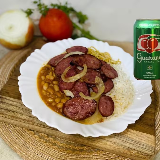 Delicioso prato de calabresa acebolada, acompanhada de feijão mulatinho ou preto, arroz branco e macarrão temperado + refrigerante 350ml Geladinha.