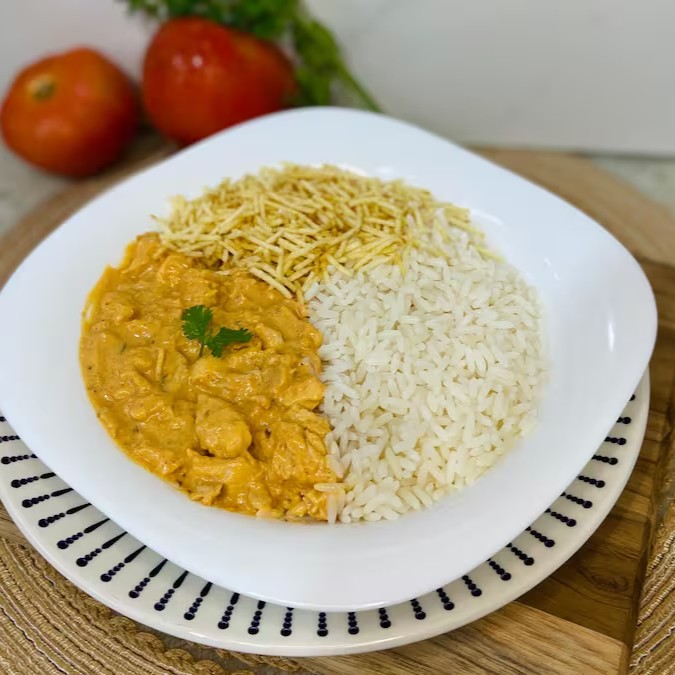 Delicioso Strogonoff de frango com arroz branco soltinho e uma porção Batata fritas.