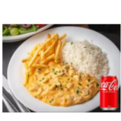 Delicioso strogonoff com fritas, acompanhado de arroz branco, Tudo feito na hora para chegar bem quentinho até você.