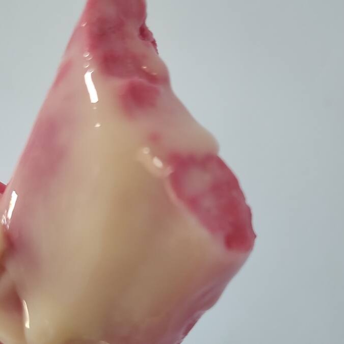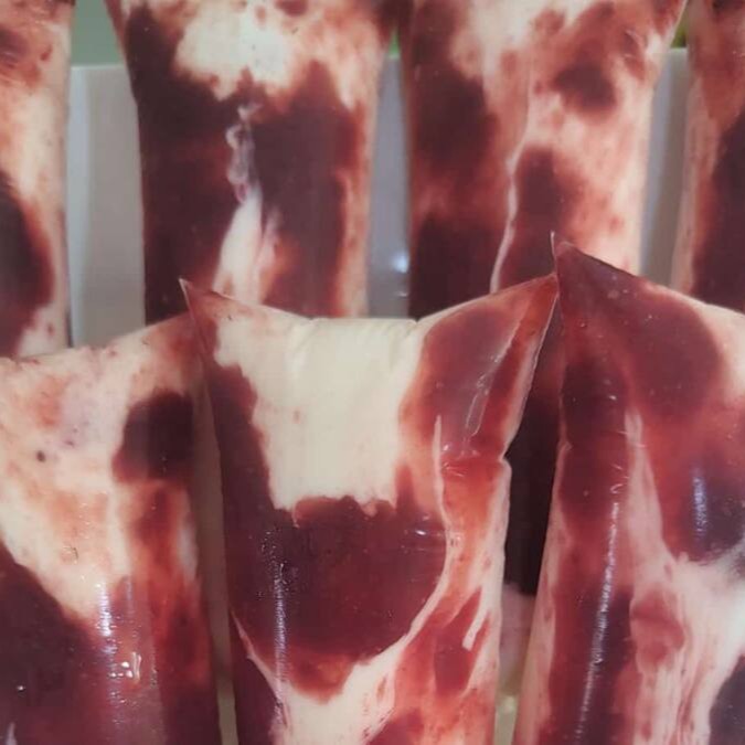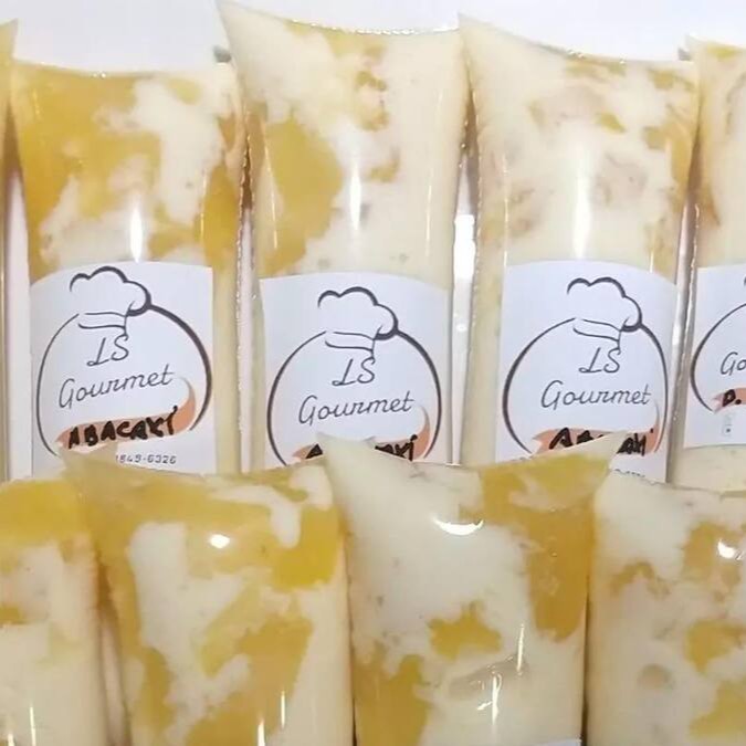 Uma base super cremosa e o delicioso, recheado com geleia de abacaxi, com pedaços de abacaxi por todo picolé
