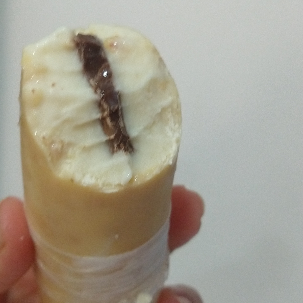 Base de baunilha que derrete na boca, com casquinha de chocolate branco por fora e por dentro um tira de chocolate meio amargo.