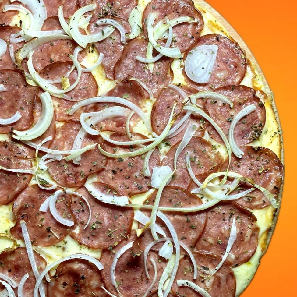 Uma Deliciosa Pizza de Calabresa Com Queijo Mussarela Selecionado, cebola e oregano. Receita especial Pim
