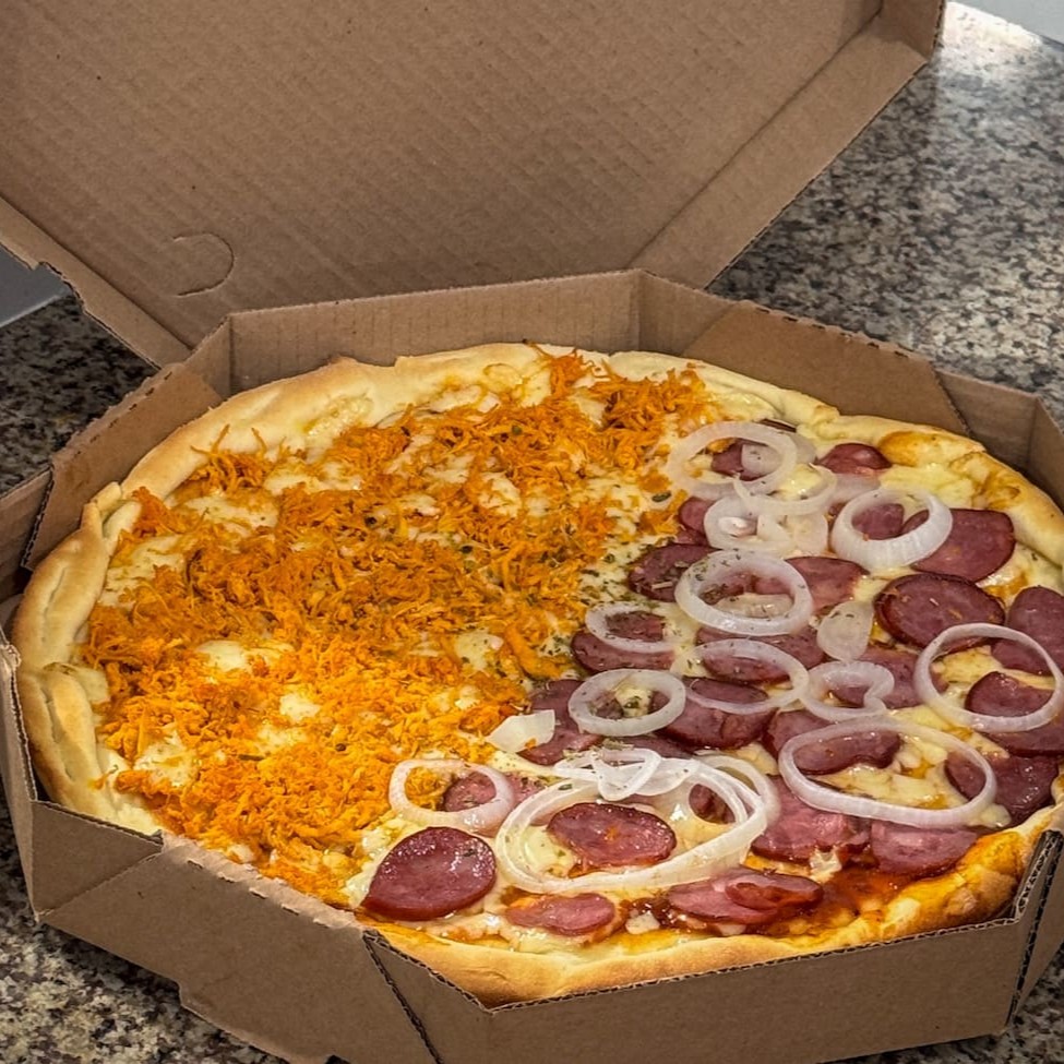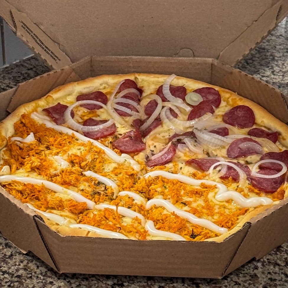 Pizza 8 fatias de frango e calabresa. Irresistível e pratica.