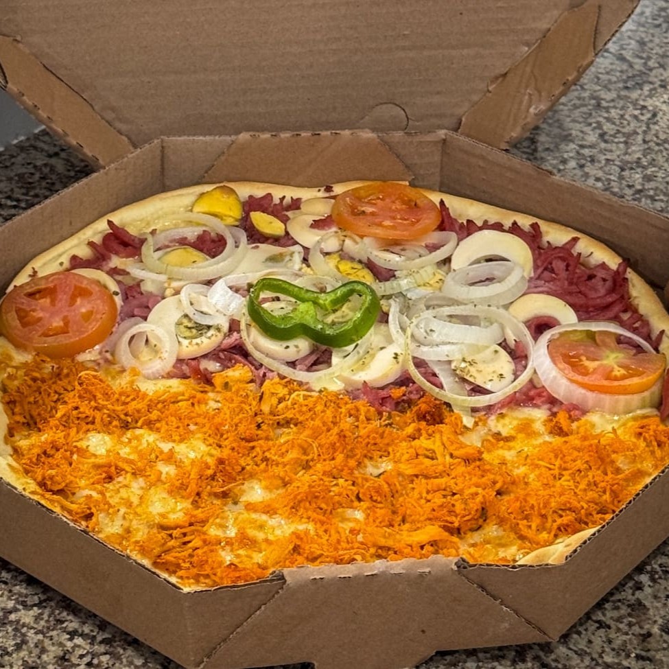Uma mistura louca e maravilhosa! Pizza 8 fatias 2 sabores, frango e portuguesa!