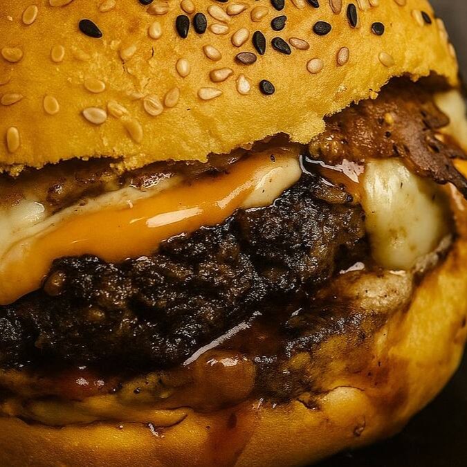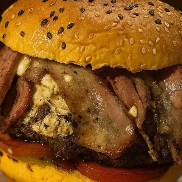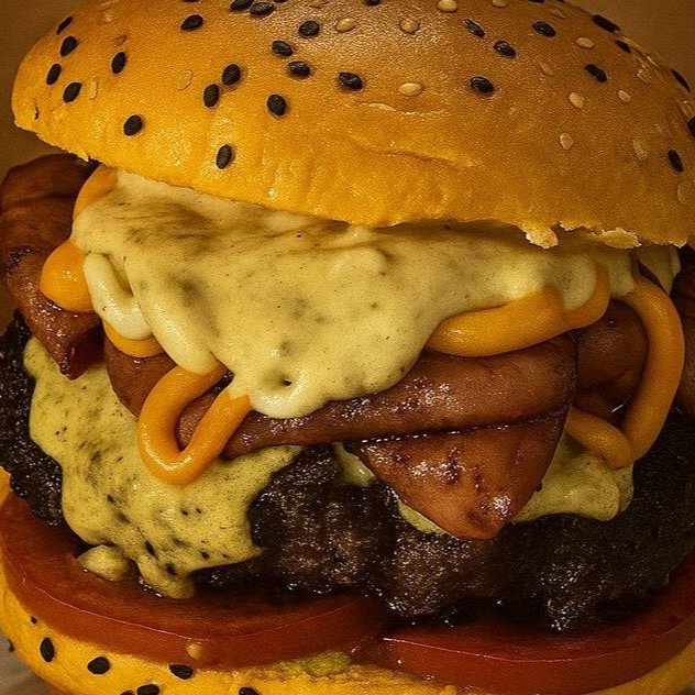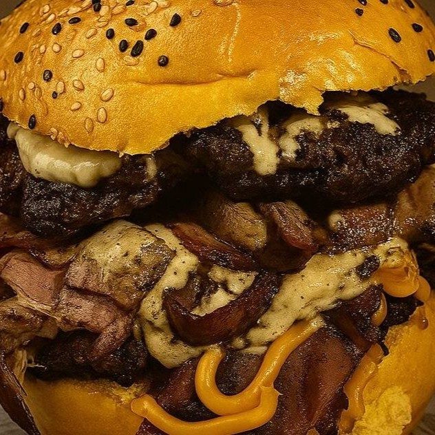 Pão Selado na Manteiga com Duas Carnes Caseiras de Um Blend Bovino (200gr Cada), Creem Chesse Cremoso, Queijo, bacon, Cheddar Cremoso, Saladas e Molho da Casa.