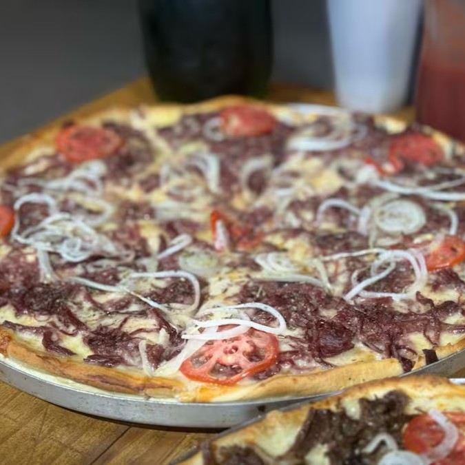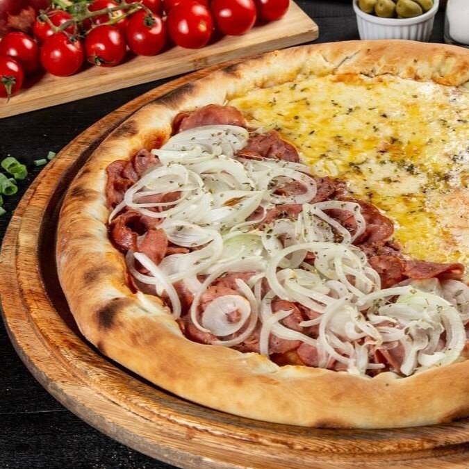 Calabresa: Massa Artesanal, Calabresa Fatiada, Queijo Mussarela, Cebola, Tomate, Azeitona, Molho de Tomate Caseiro Finalizada com Orégano.