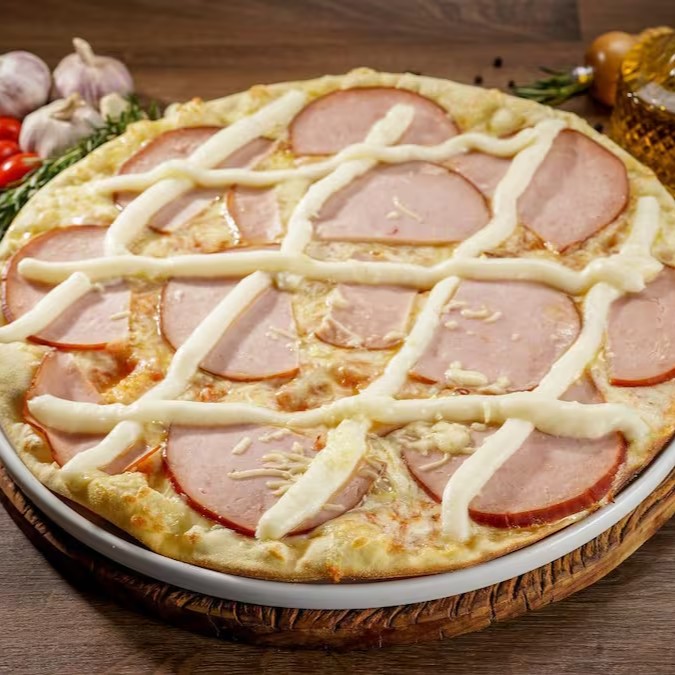 Mussarela, presunto, ovos, cebola, azeitona, Catupiry e orégano.