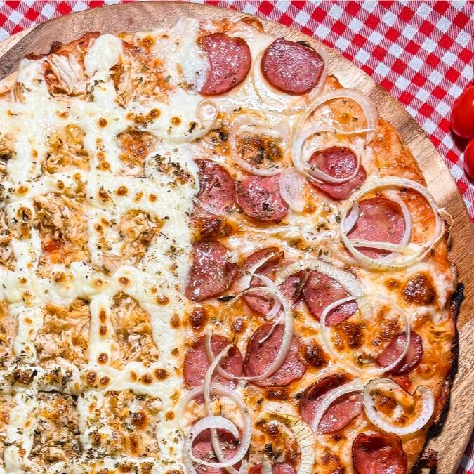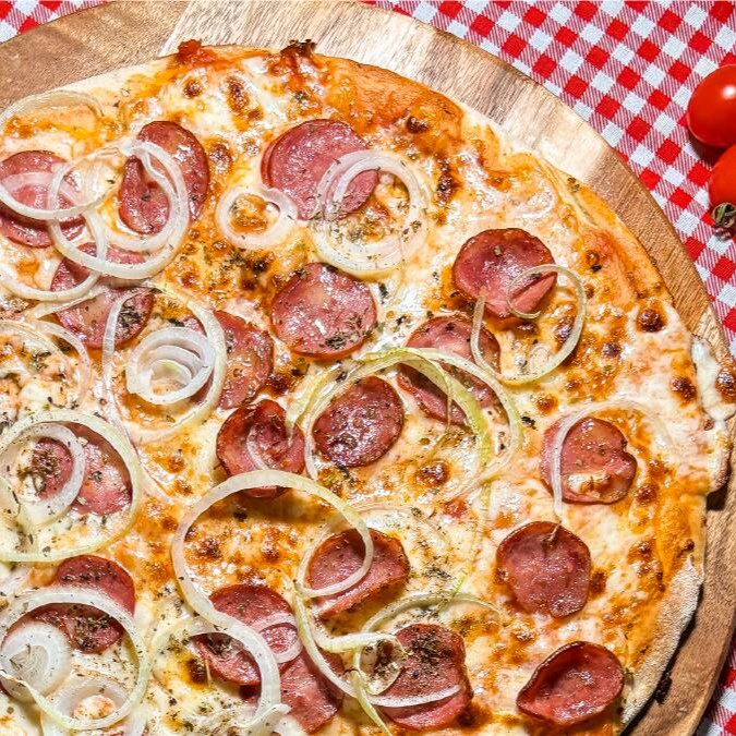 Aquela calabresa arretada, com fatias no ponto, cebola fresquinha, muçarela cremosa e orégano. É o clássico que nunca perde a vez, viu?