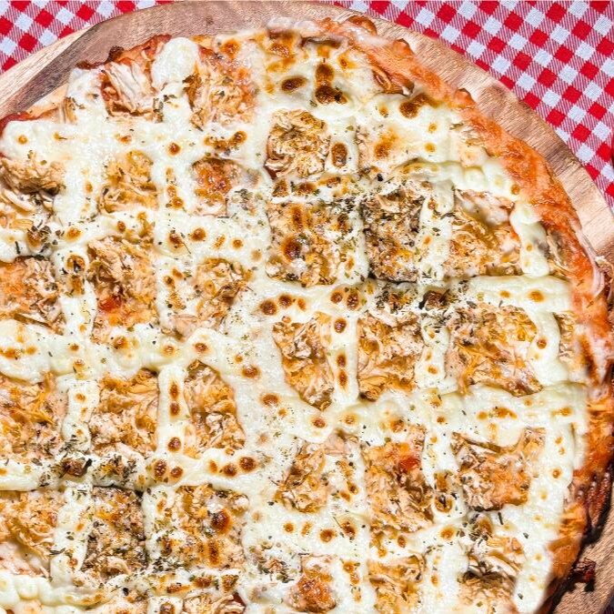 Frango Catupiry: molho de tomate, muçarela, frango desfiado, Catupiry e orégano.