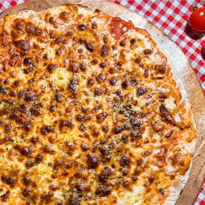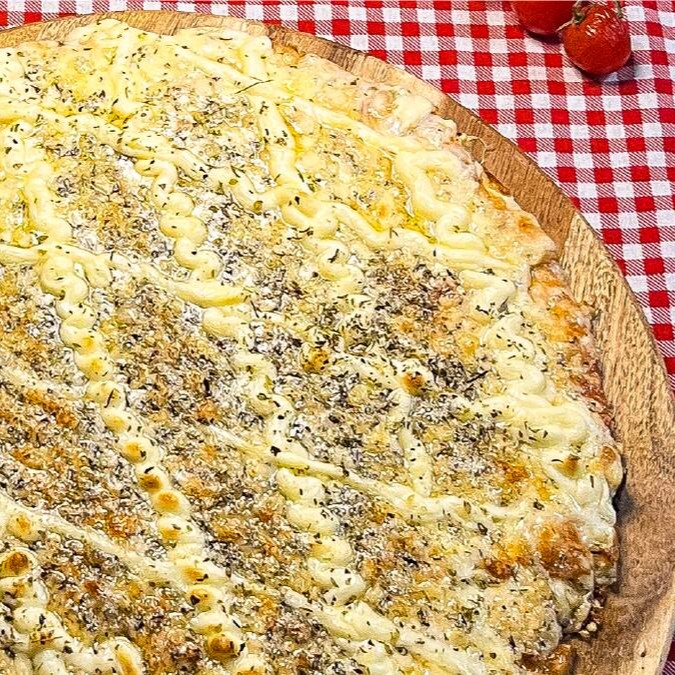 É básica, mas faz bonito! Massa crocante, molho de tomate caseiro, muçarela derretendo gostoso e orégano pra dar aquele toque. Pra dividir ou comer sozinho, sem frescura.