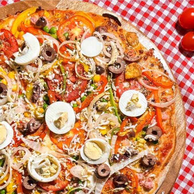 Essa aqui é completíssima, viu? Ovo cozido, pimentão colorido, tomate, milho, ervilha, cebola, azeitonas e muçarela. Cada pedaço é um pedacinho do paraíso!
