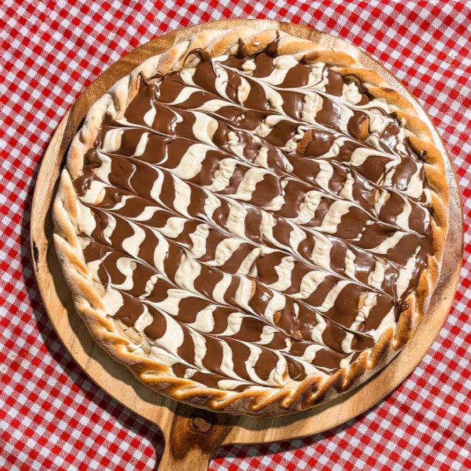 Massa de pizza com rechieo de creme de chocolate e de Ninho.