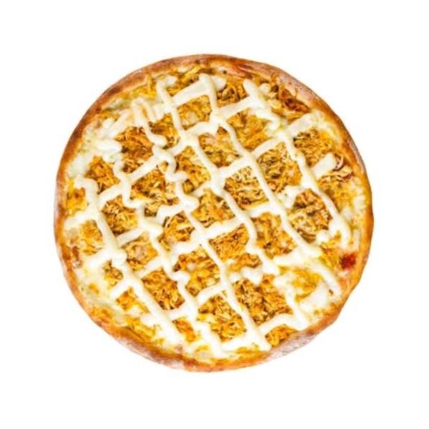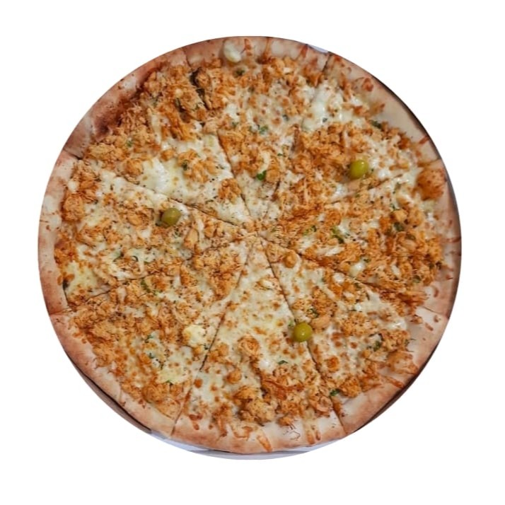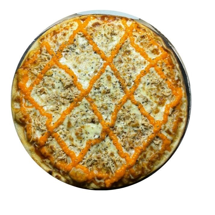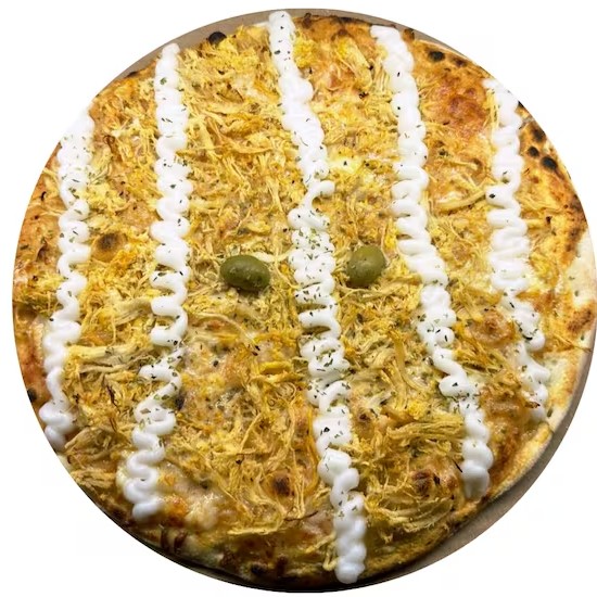 Massa artesanal, molho, mussarela, frango desfiado, cheddar, orégano.