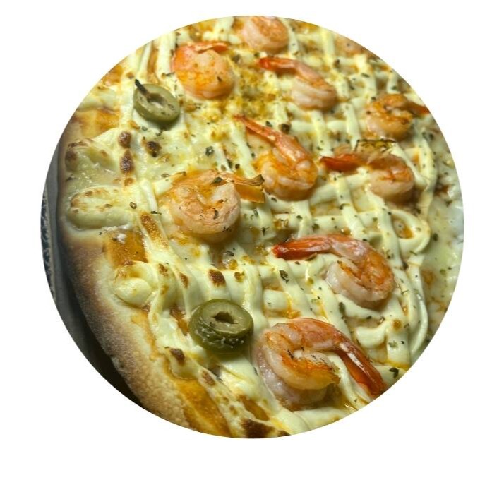 Massa artesanal, molho, mussarela, Camarão fresco, cream cheese e finalizada com orégano