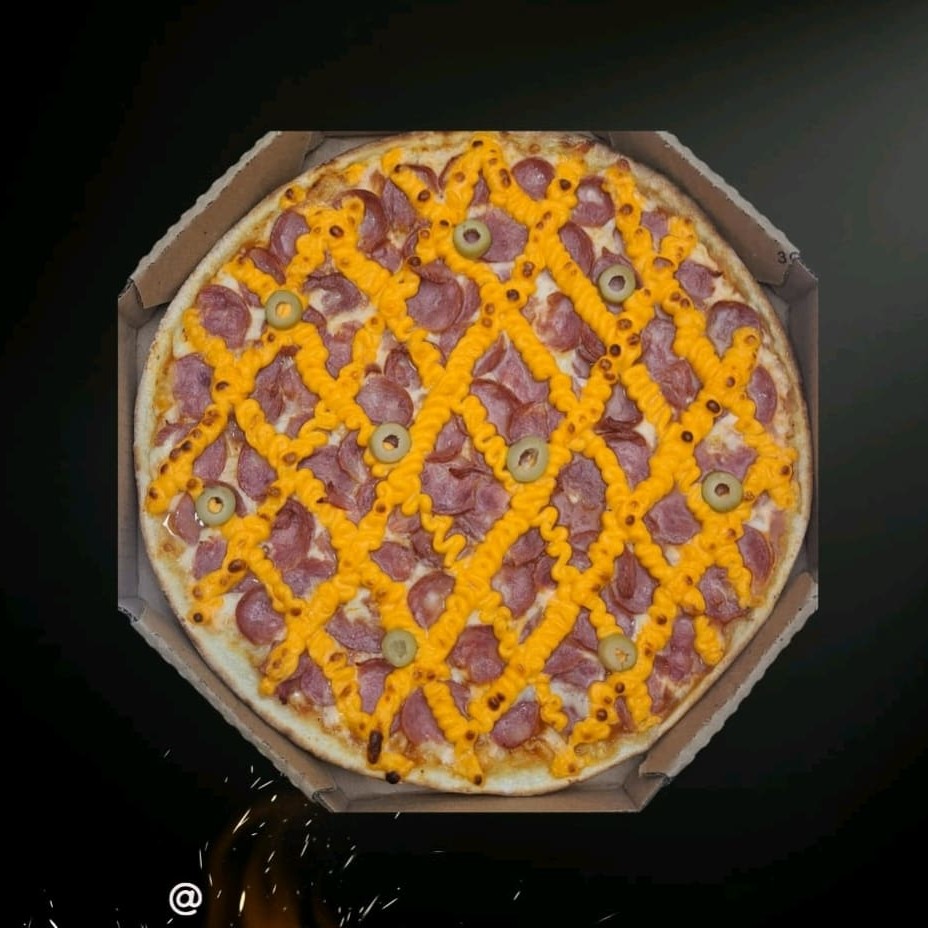 Massa artesanal, molho, mussarela, calabresa, cheddar e finalizada com oregano