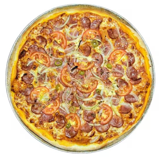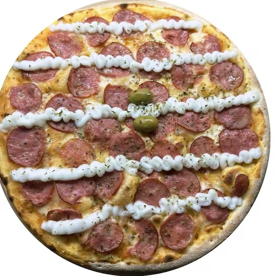 Massa artesanal, molho, mussarela, calabresa, catupiry, oregano