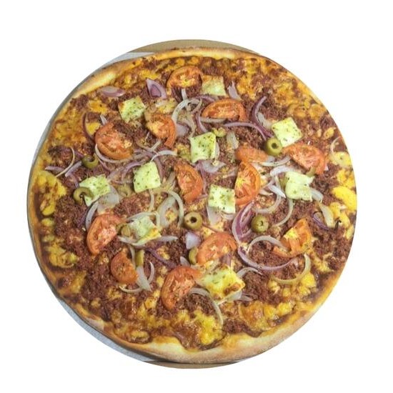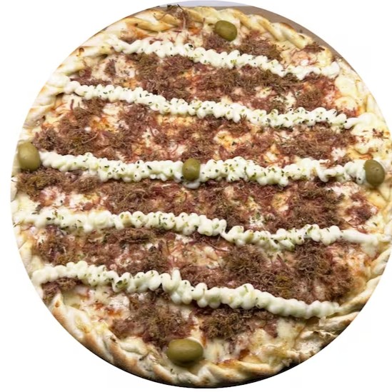 Massa artesanal, molho, mussarela, charque desfiada, queijo coalho, cebola, tomate e finalizada com orégano