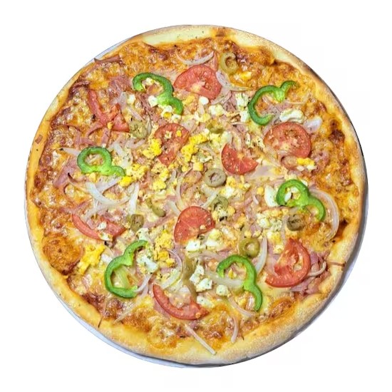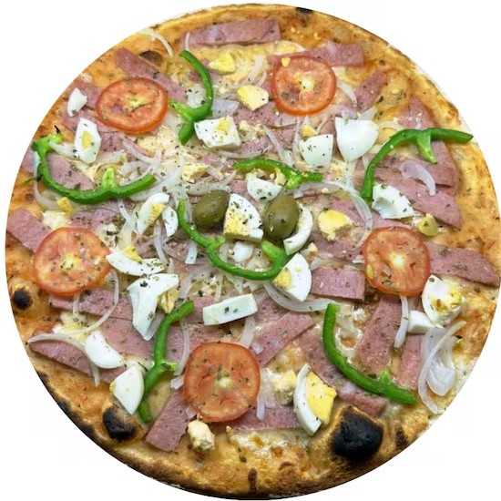 Massa artesanal, molho, mussarela, presunto, ovo cozido, pimentão, cebola, tomate e finalizada com orégano.