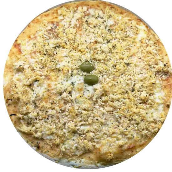 Massa artesanal, molho, mussarela, frango, Catupiry e finalizada com orégano.