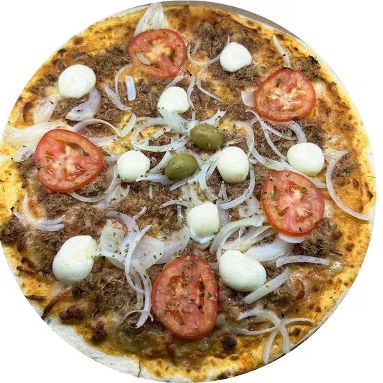 Massa artesanal, molho, mussarela, presun,to,tomate, cebola, ovo cozido, pimentão, oregano