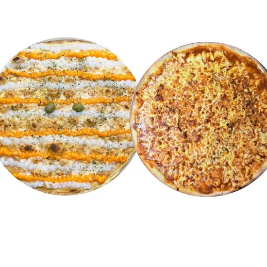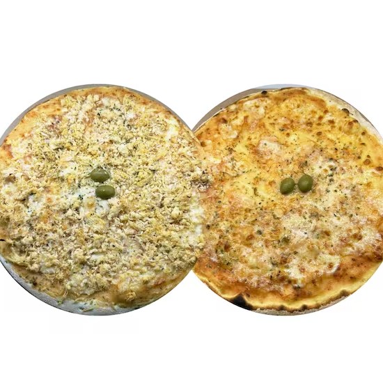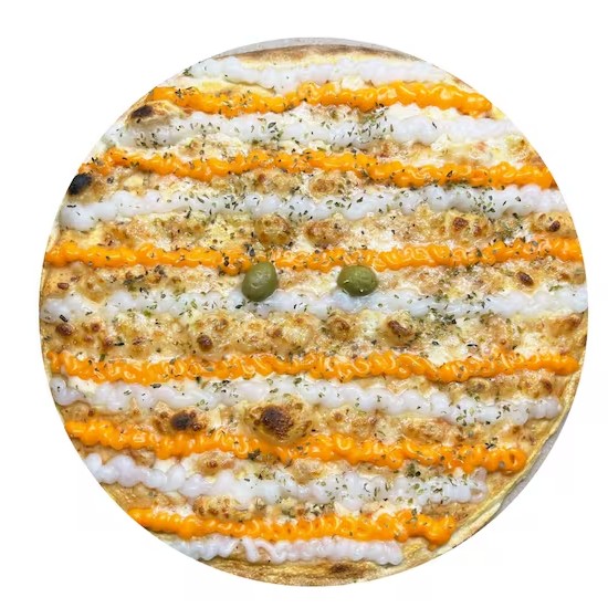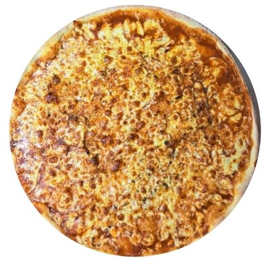 Massa artesanal, molho, mussarela, cheddar, requeijão, oregano.