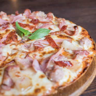 Massa com fermentação natural e artesanal, molho de tomate especial caseiro, queijo mussarela, bacon em fatias defumado e orégano.