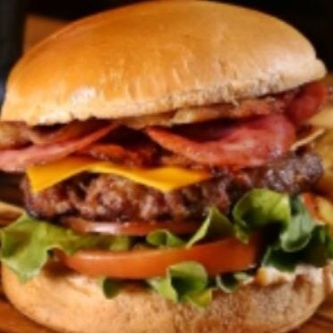 Pão brioche, carne de 100g. Queijo, molho alface, tomate e bacon .