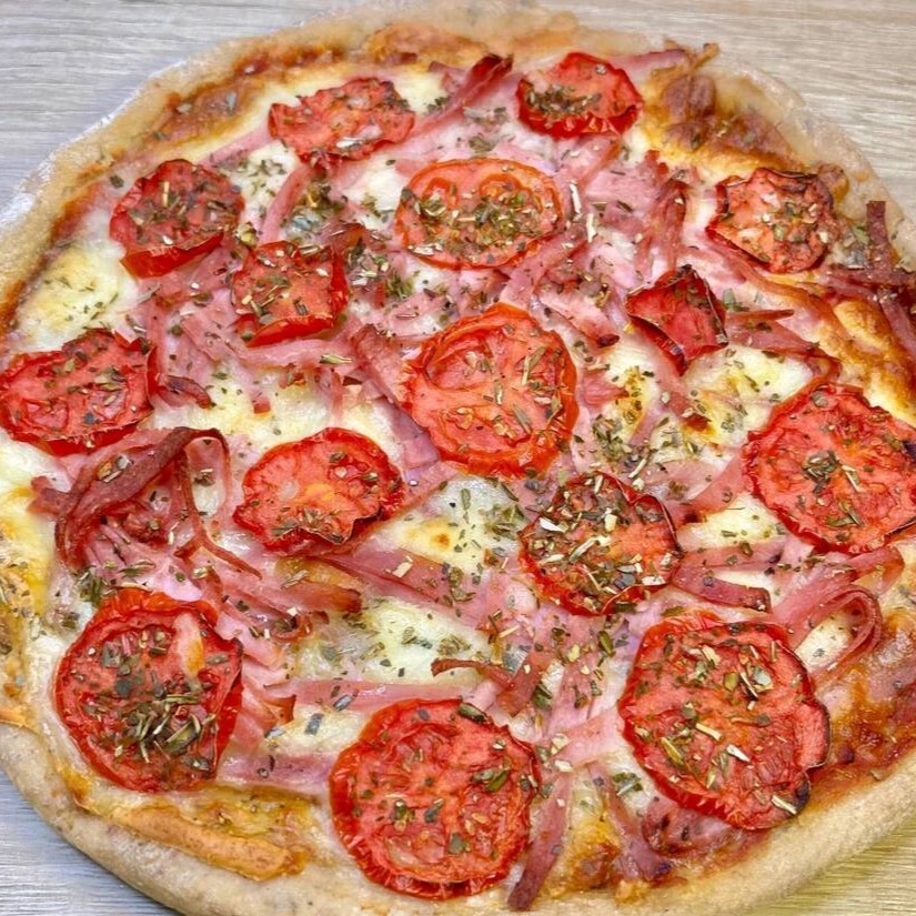 Massa tradicional, molho pomodoro cobertura de queijo mussarela, tomate em rodelas e orégano