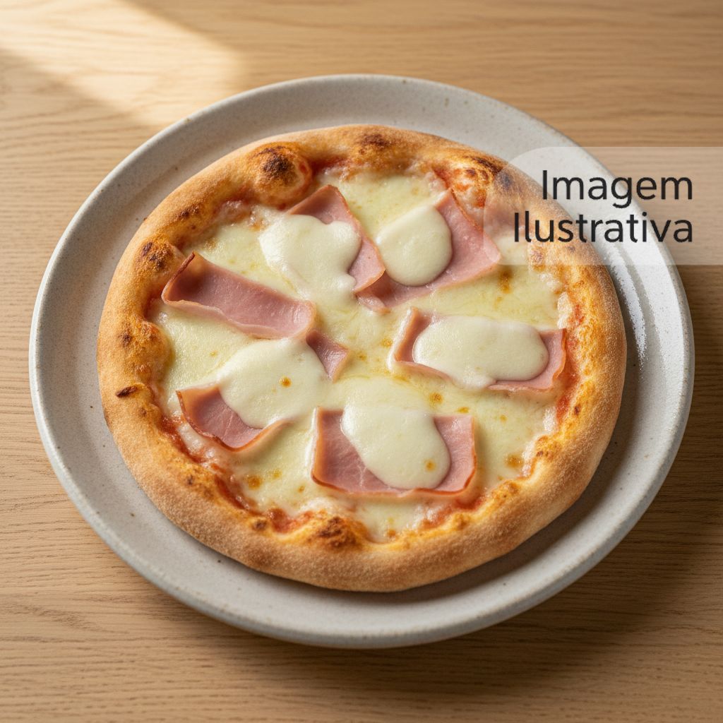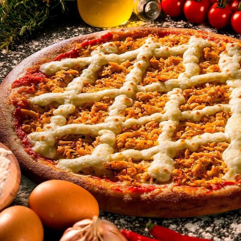 Massa tradicional, molho pomodoro, cobertura de queijo mussarela, filé de frango desfiado finalizado com requeijão