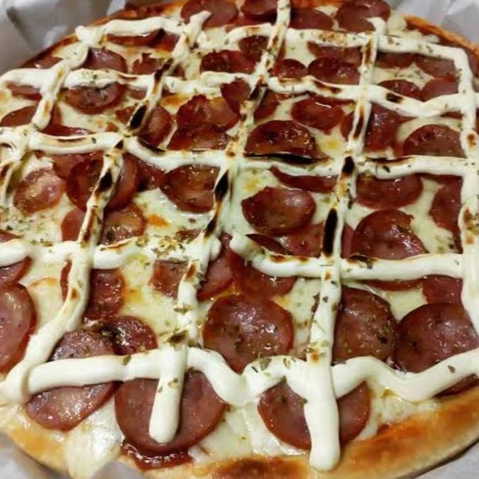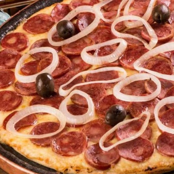Molho de tomate caseiro,mussarela,pepperoni,cebola,presunto,tomate Orègano.