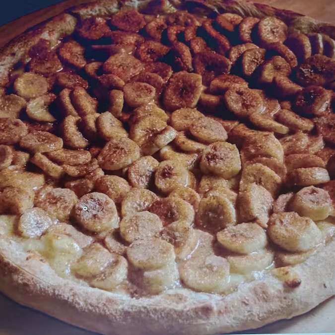 Frango com Catupiry,molho de tomate,caseiro,mussarela,e Orégano.+ cartola,com base de mussarela,banana,leite condensado,canela e açucar.(pizza,doce.)