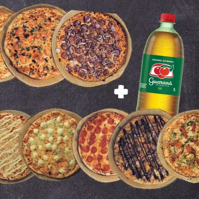 Você pode escolher duas pizzas de tamanho grande e ainda leva um Guaraná Antarctica de 1l grátis.