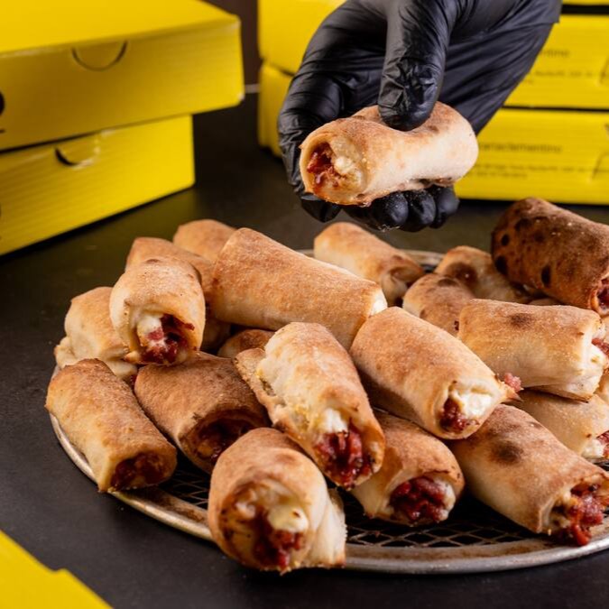 Delicioso Pãozinho Recheado de Calabresa. As bordinhas são generosamente recheadas com cream cheese cremoso e suave, combinado com a calabresa finamente ralada, proporcionando um sabor defumado e picante irresistível. Tudo isso é harmonizado com um toque doce e levemente picante do molho barbecue, resultando em uma combinação de sabores inesquecível.