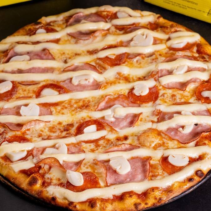 Molho de tomate especial da casa, queijo mussarela, lombo suíno defumado, pepperoni, champignon, tomate, e catupiry.