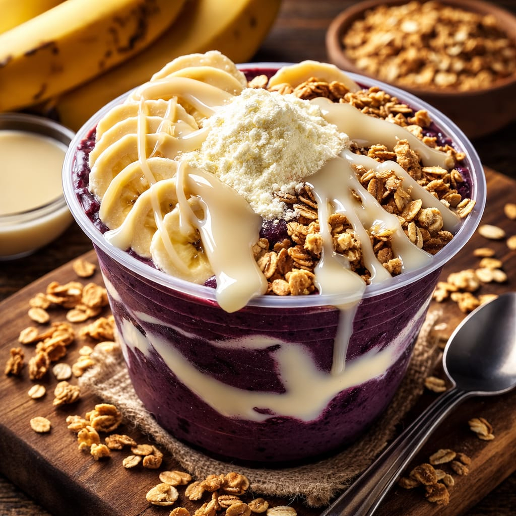 Refrescante açaí com granola, banana, leite em pó e leite condensado.
