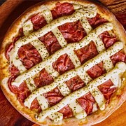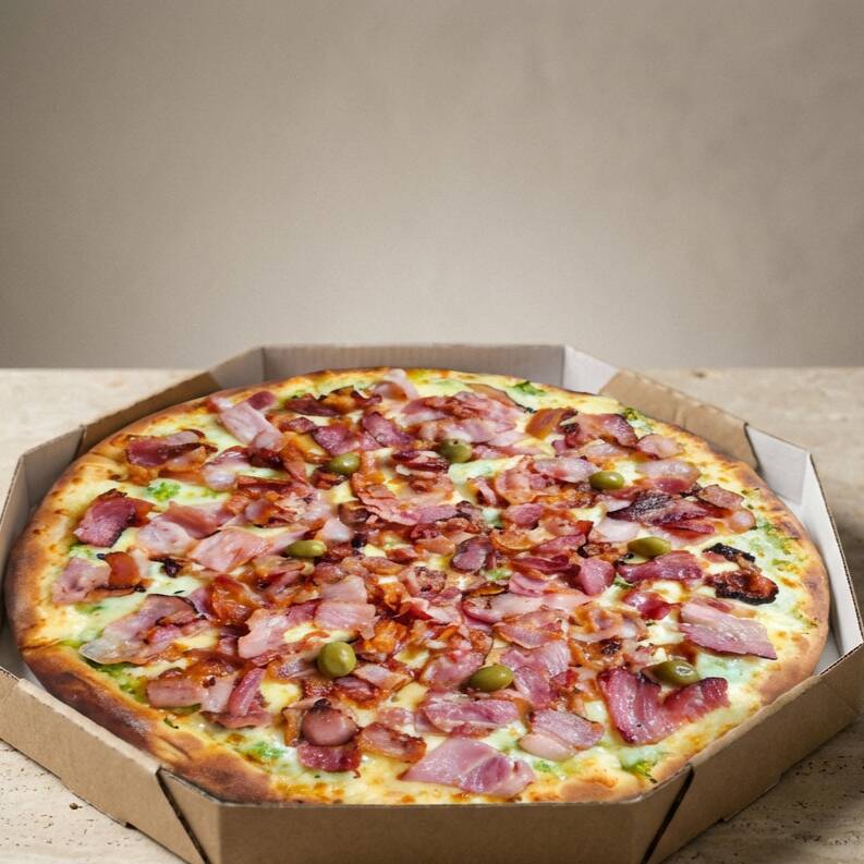 Bacon Crocante e Saboroso com Generosa Camada de Mussarela Derretida, sobre Nosso Molho Artesanal e uma Deliciosa Massa Fina.