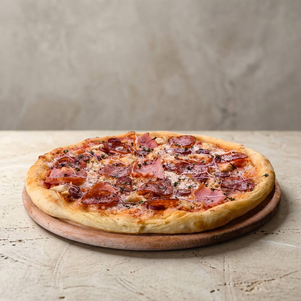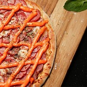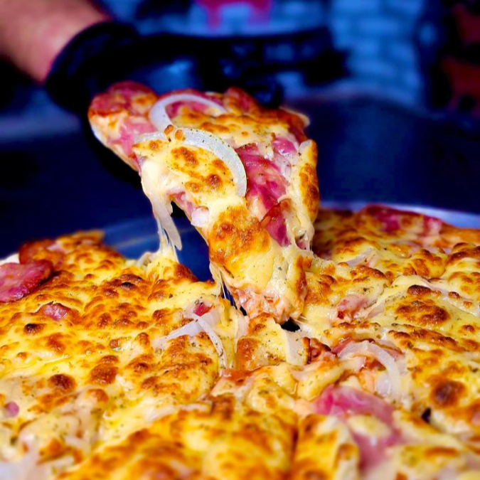 Calabresa Saborosa e Bacon Crocante, Cobertos por Mussarela Derretida, Nosso Molho Especial e uma Deliciosa Massa Fina.