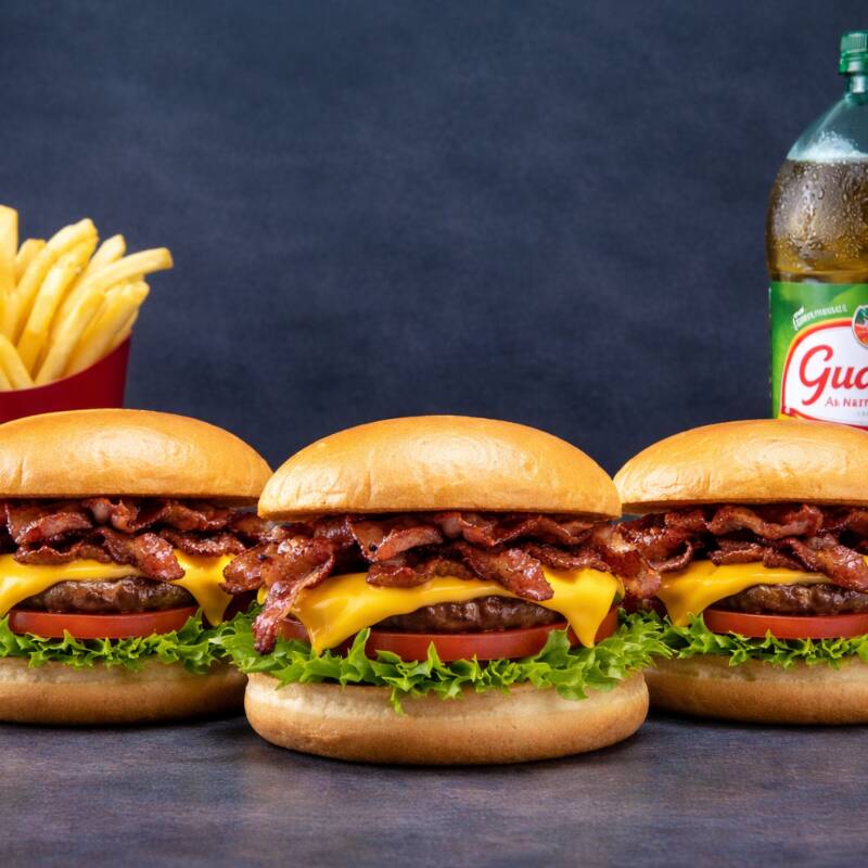 3 X-Bacon suculentos com muito sabor, acompanhados de batata frita crocante e Guaraná 1L bem gelado. Perfeito para dividir e aproveitar! 😋